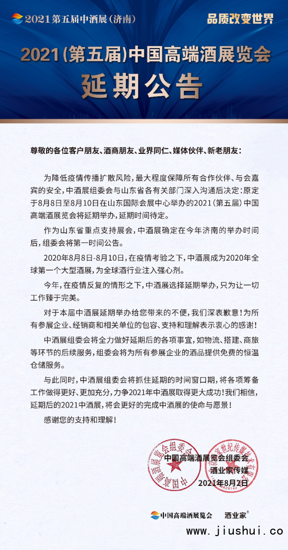 8月2日,中国高端酒展览会组委会发布公告,原定于8月8日—8月10日在山东国际会展中心举办的第五届中国高端酒展览会将延期举办,作为山东省重点支持的大型展会,中酒展组委会也将第一时间确认新的举办档期,并通知广大的参展商、经销商和各界人士。