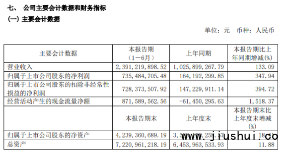 半年报显示,舍得酒业2021上半年实现营业收入23.9亿元,同比增长133.09%,实现归属上市公司股东净利润7.35亿元,同比增长347.94%。