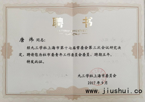 经九三学社上海市第十七届委员会第三次会议研究决定,聘请上海开山酒业创始人、董事长唐炜先生为社市委青年工作委员会委员,任期为五年。