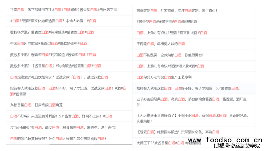看完了链路,我们再来看看白酒的广告文案,广告文案呈现产品的核心卖点与主要的测试方向。通过对大盘白酒相关的文案进行分析,53度的酱香型白酒受茅台的品牌影响在消费者之间的认知度是最高的,在广告文案中经常出现,产品一致的话是可以重点体现的。工艺也是广告文案中反复提及的,纯粮酿造是用户认知相对较高的工艺特点。不管选择什么链路,在素材&文案测试上,都是可以反复测试的点。