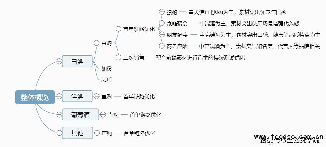 现在整体在看下,不同用户需求场景下,不同的广告链路,我们的优化思路应该是怎么样的呢?以直购为例:对于用户首单购买的优化,不同用户场景下主打的酒类也是不同的,对应的素材方向也是不同的;一人独酌场景下,整箱售出的酱香型酒就是主打的sku了,素材方向上更多的是突出价格上的优惠,以及酒品的口感了;在家庭聚会场景下,中间价位的酒可以做为主力推广,素材方向上更多的贴近用户的聚会场景来加强用户的代入感;在朋友聚会场景下,中高端的酒都可以重点推广试试,素材方向上可以以口感、健康等品质特点为主;在商务应酬场景下,中高端酒也是可以作为重点sku来推的,素材上需要重点突出知名度以及代言人等品牌相关的信息。看完首单链路,在直购模式下的二次销售是广告主增加利润点的重要方式,以客服角色添加客户微信,进行二次销售,给广告主带来了更多的高价值用户。加粉链路&表单链路同理也是根据不同使用场景下的诉求,有针对性的进行引导,进而提升转化效率。