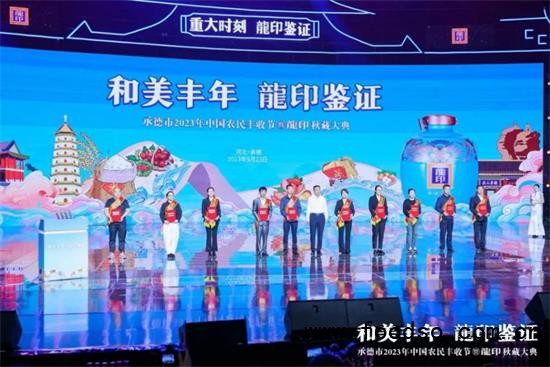 礼赞丰收年,共品龍印酒。9 月 23 日,由承德市人民政府、河北广播电视台(集团)联合主办;由承德县人民政府、承德市农业农村局、承德市体育局协办;由承德县农业农村局、河北板城酒业、河北广电广告有限责任公司承办的承德市 2023 年中国农民丰收节暨龍印秋藏大典在承德市奥体中心圆满落下帷幕。板城酒业驾起卓越追求的时代巨轮,乘历史文脉之桨,掌匠心传承之舵,扬帆起航,再次谱写龍印 " 秋藏大典 " 品牌文化 IP 的时代篇章。