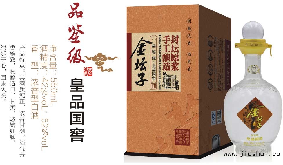 目前“打开金坛子,幸福一辈子”的口号响遍全国,具有很高的市场知名度和美誉度,产品畅销苏鲁豫皖、闽赣鄂湘、云贵粤甘等十几个省区。 安徽金口酒业有限公司承袭了徽酒之精华,生产的“金坛子”牌系列白酒已收获了“中国著名品牌”“安徽省著名商标”“中国白酒知名信誉品牌”“中原十大新锐品牌”“安徽消费者喜爱的名优白酒品牌”等荣誉。