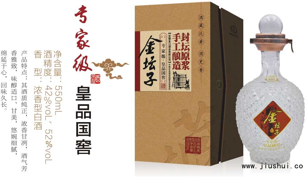 目前“打开金坛子,幸福一辈子”的口号响遍全国,具有很高的市场知名度和美誉度,产品畅销苏鲁豫皖、闽赣鄂湘、云贵粤甘等十几个省区。 安徽金口酒业有限公司承袭了徽酒之精华,生产的“金坛子”牌系列白酒已收获了“中国著名品牌”“安徽省著名商标”“中国白酒知名信誉品牌”“中原十大新锐品牌”“安徽消费者喜爱的名优白酒品牌”等荣誉。