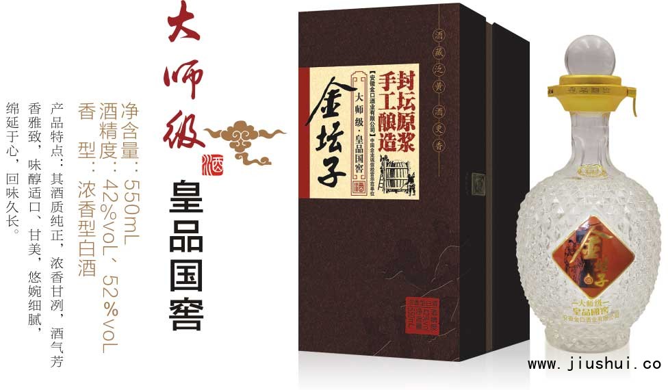 目前“打开金坛子,幸福一辈子”的口号响遍全国,具有很高的市场知名度和美誉度,产品畅销苏鲁豫皖、闽赣鄂湘、云贵粤甘等十几个省区。 安徽金口酒业有限公司承袭了徽酒之精华,生产的“金坛子”牌系列白酒已收获了“中国著名品牌”“安徽省著名商标”“中国白酒知名信誉品牌”“中原十大新锐品牌”“安徽消费者喜爱的名优白酒品牌”等荣誉。