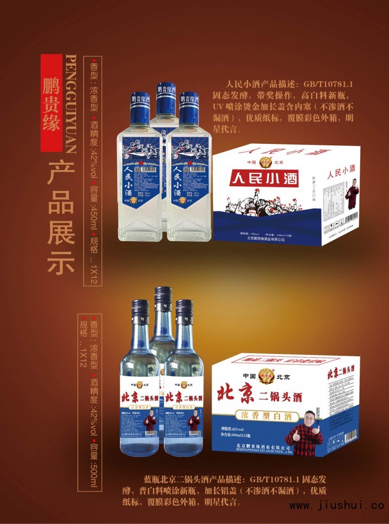 公司所辖实体酒厂座落在古运河畔,黄河故道所经之地的武城,占地30余亩,拥有**调酒师酿酒师2名,拥有一个酿造车间、三条全自动生产线。公司常年与泸州老窖酒厂合作,先后开发出“鹏贵缘”原浆酒、二锅头系列、苦荞酒系列、青春时尚白酒等系列白酒,产品远销三十多个省市自治区。