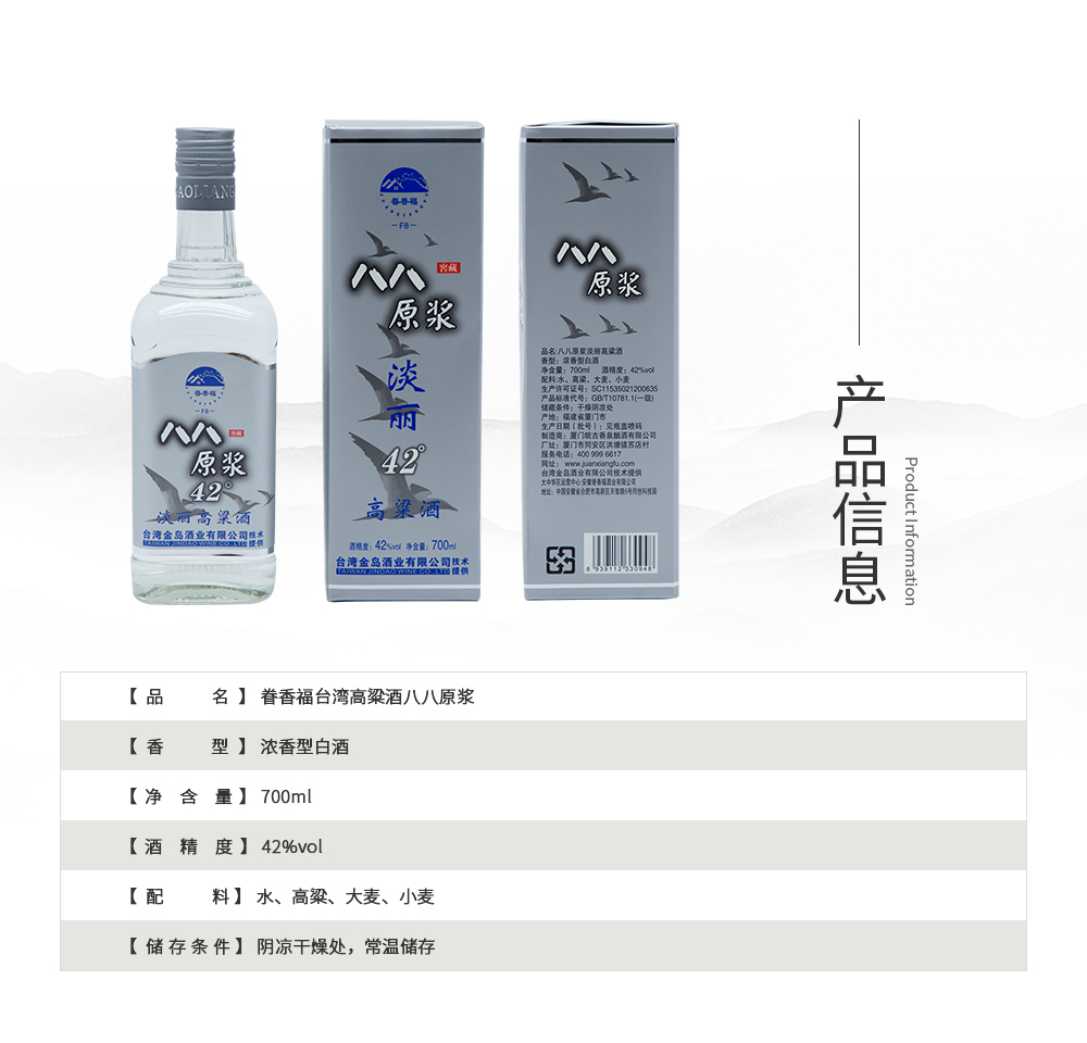 安徽眷香福酒业有限公司秉承“宝岛眷香福,两岸一家亲”的情感理念,“千里眷念情不忘”,联合推出一系列低度、中度、高度浓香型“眷香福”高粱酒,以促进两岸文化交流和弘扬中国传统酒文化。