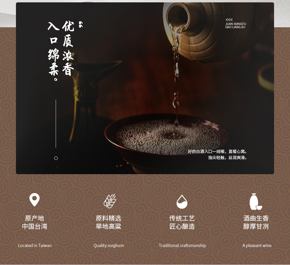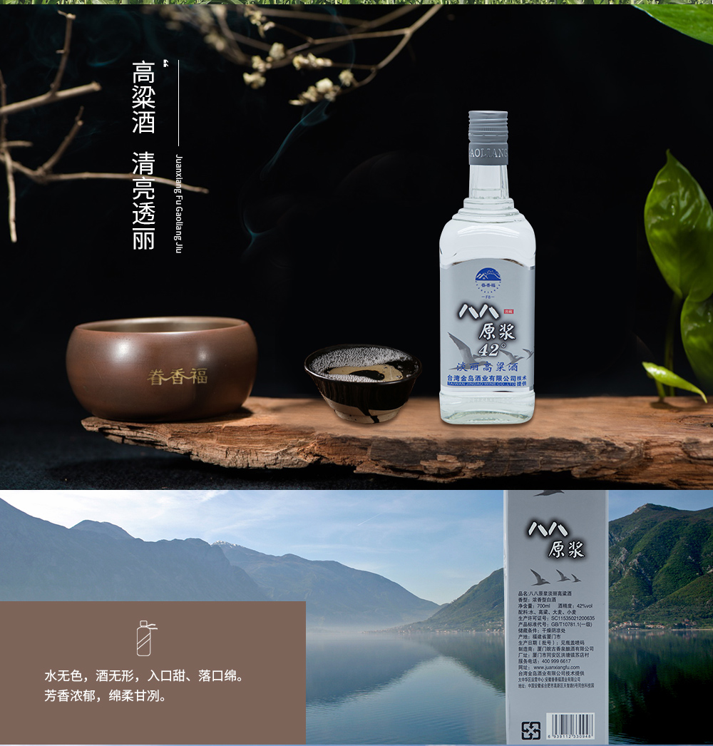 好酒必有好水," 为有源头活水来 "。优质水源,是酒水品质成功的关键。眷香福酒水主体来自台湾当地水质甘甜的“宝月神泉”,利用特产旱地高粱,并且引用,加上当地酿酒师傅的专业经验,酿造出风味独特,香、醇、甘、冽的高粱酒--眷香福高粱酒。