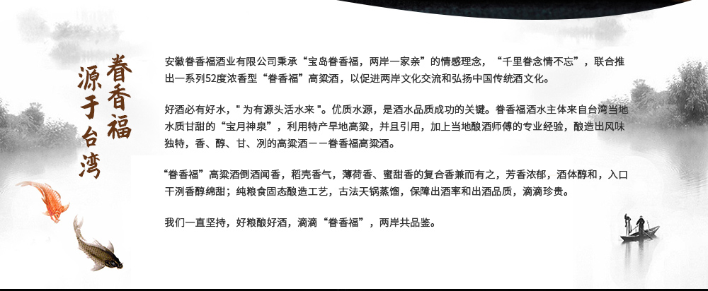 安徽眷香福酒业有限公司秉承“宝岛眷香福,两岸一家亲”的情感理念,“千里眷念情不忘”,联合推出一系列低度、中度、高度浓香型“眷香福”高粱酒,以促进两岸文化交流和弘扬中国传统酒文化。