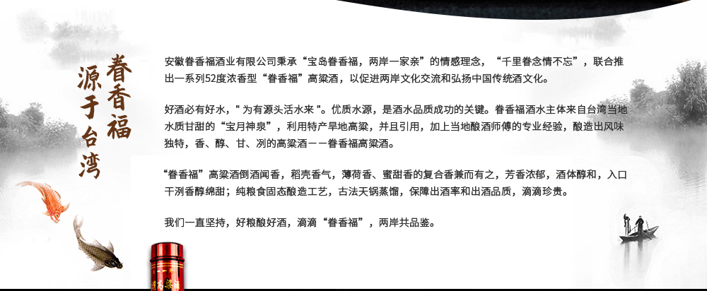 安徽眷香福酒业有限公司秉承“宝岛眷香福,两岸一家亲”的情感理念,“千里眷念情不忘”,联合推出一系列低度、中度、高度浓香型“眷香福”高粱酒,以促进两岸文化交流和弘扬中国传统酒文化。