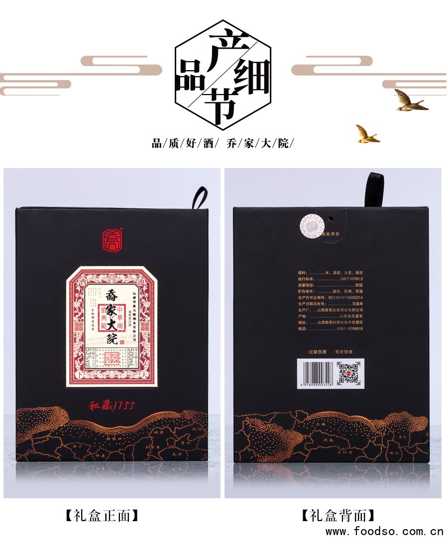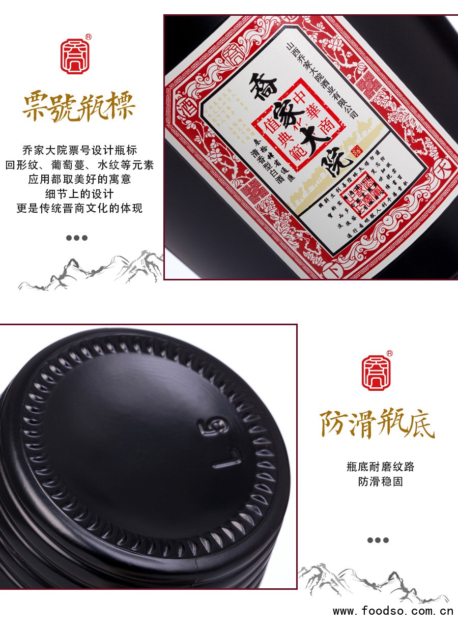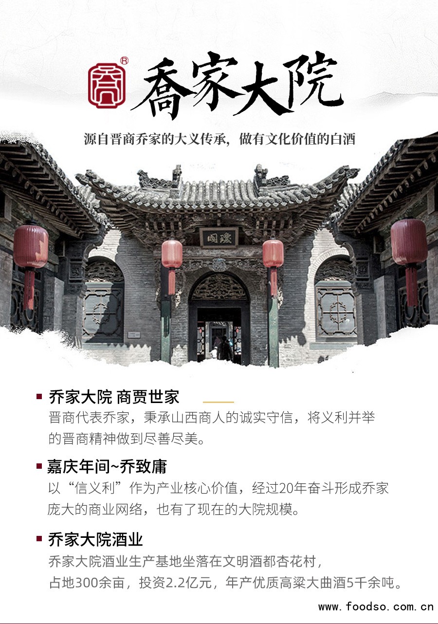 乔家大院酒业续乔家商业精神,秉承乔氏家族乔致庸的用人之道和经商之道,致力于将乔家文化、晋商精神发扬光大。
