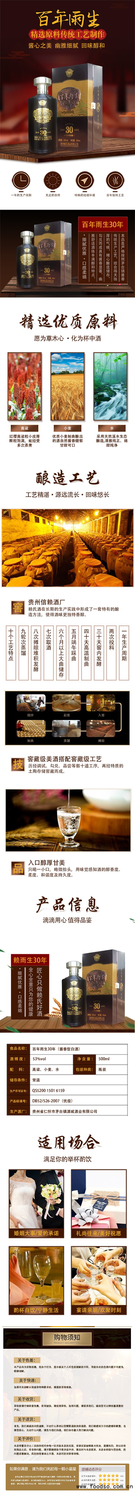 百年雨生30年酱香型白酒500ml是由贵州百年赖氏酒业有限公司经营的白酒 系列产品,现面向全国诚招代理商!百年雨生30年酱香型白酒500ml采用独特工艺精心酿制而成,酒质优良,醇馥幽郁,深受消费者喜爱。