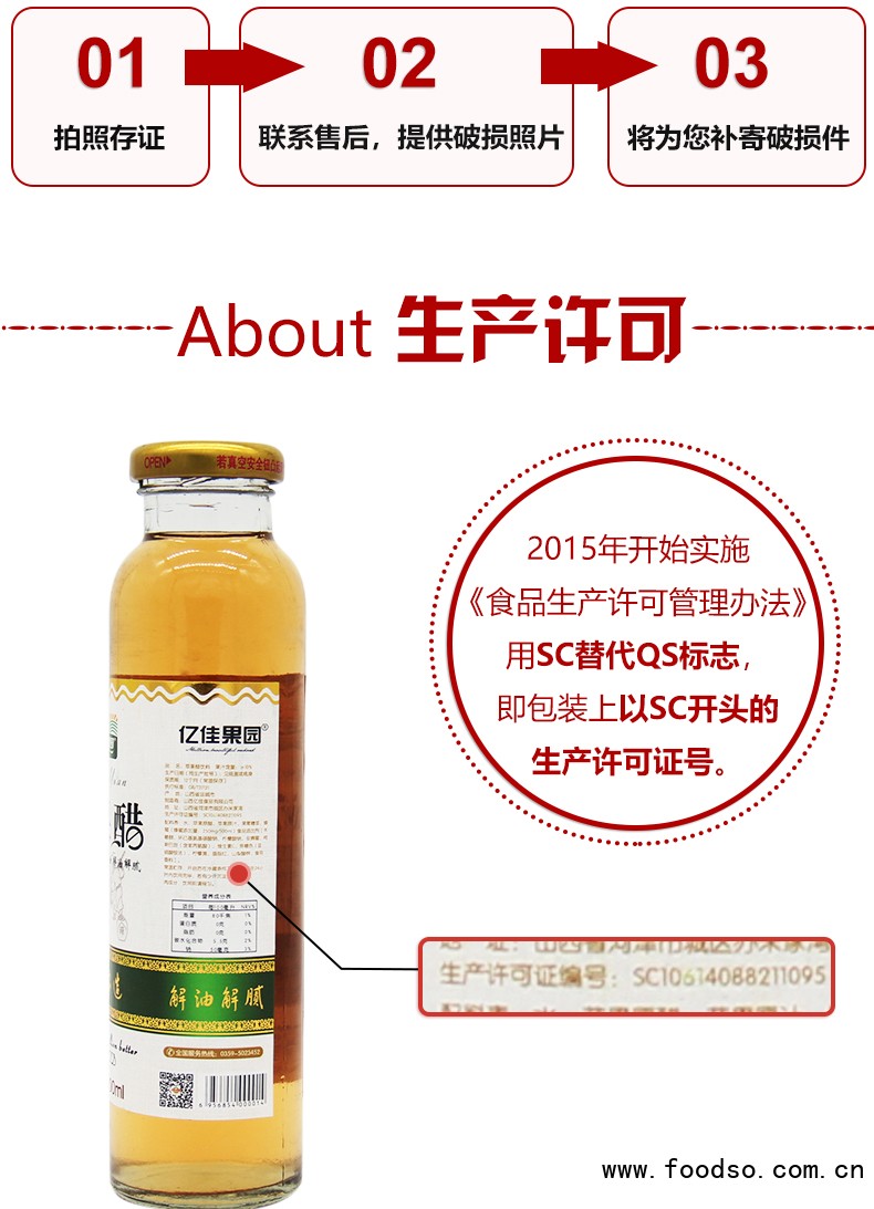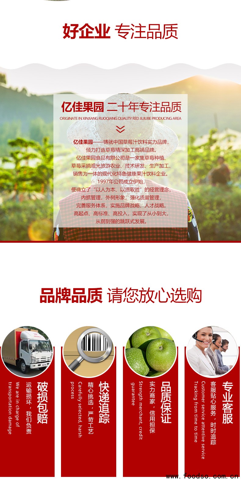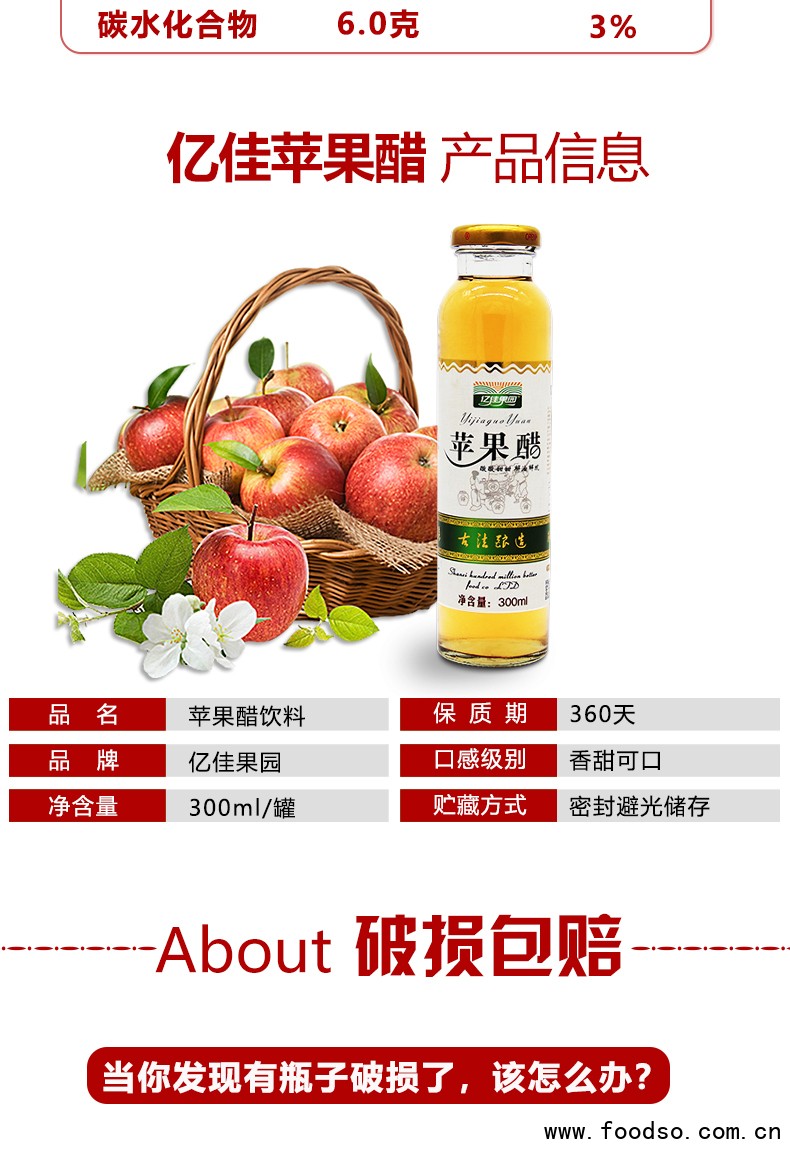 制造优质产品,引 领健康生活,一直是亿佳果园的企业愿景,公司主打产品草莓汁 饮料始终坚持优质草莓生榨、绝不添加一滴香精、一颗糖精,原汁原味带给广大消费者健康、品质、美味的全新感受;自主研发的新一代天然绿色健康饮品——苹果醋、山楂汁、红枣汁,更是沿袭古方,秉承原生态科学理念,结合现代工艺而生产,亿佳果园倡导“食疗养生”“药食同源”的科学理念,让 消费者享受果汁美味的同时,营养更均衡,身体更健康!产品上市以来深受消费者青睐。