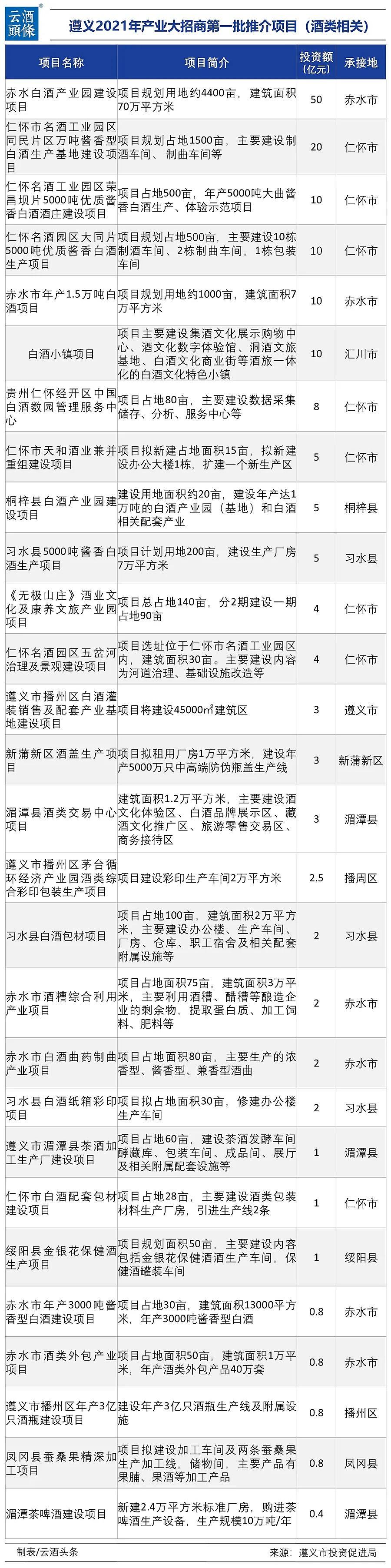 【中国白酒网】近日,《遵义2021年产业大招商第一批推介项目》发布,项目书中与酒类产业直接或间接相关的项目29个,总投资规模约167.1亿元,详细名单如下: